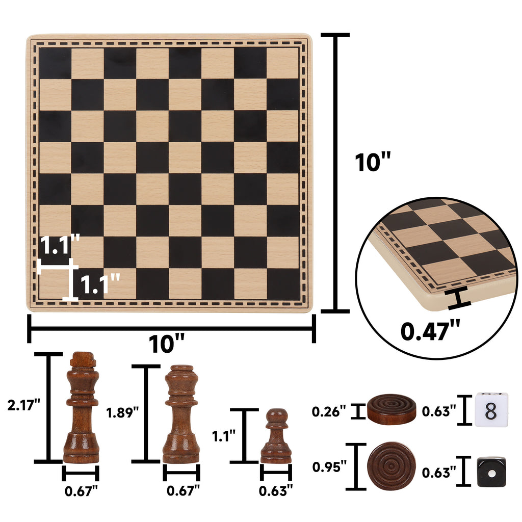 10" Wooden 3-in-1 Travel Size Chess Checkers Backgammon Board Game Combo Set for Kids & Adults