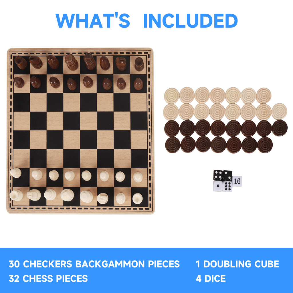 • What's Included: The chess, checkers, and backgammon set includes a game board, a complete set of 32 chess pieces, 30 pieces for backgammon/checkers games, two pairs of dice, a doubling cube, and instructions for all games